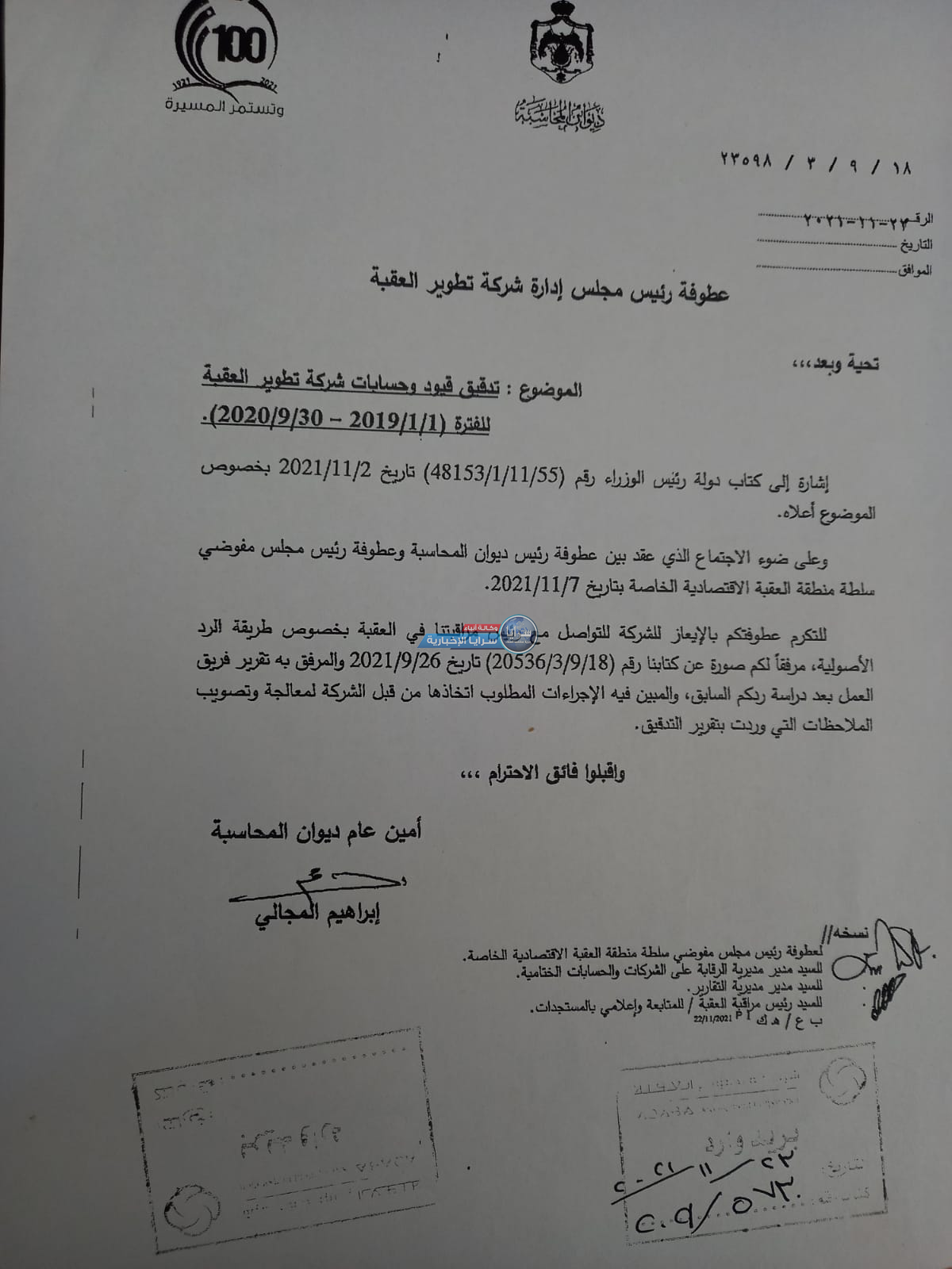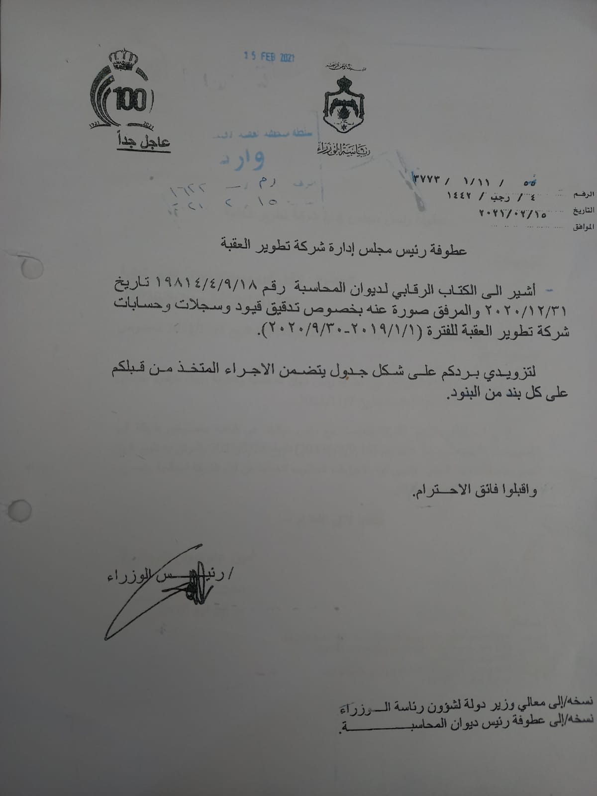 سرايا - العقبة – يوسف الطورة - طالب رئيس الوزراء في كتاب وجه لرئيس مجلس إدارة شركة تطوير العقبة، رئيس مجلس المفوضين نايف بخيت ، ضرورة الرد وتوضيح إجراءات معالجة وتصويب كافة الملاحظات الواردة في تقرير ديوان المحاسبة ، المتعلق بتدقيق قيود وسجلات وحسابات الشركة للفترة من 1/1/2019 ولغاية 30/9/2020.