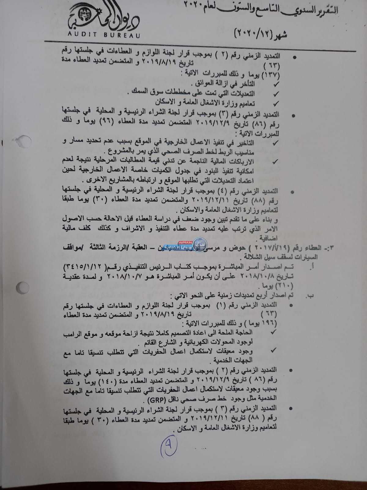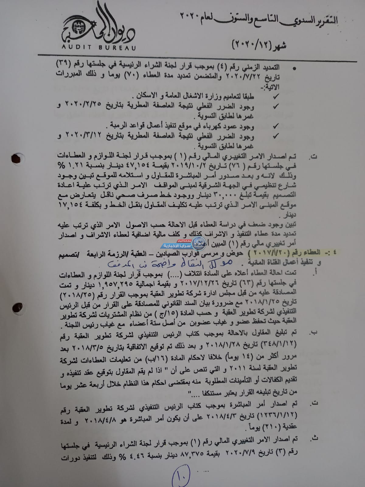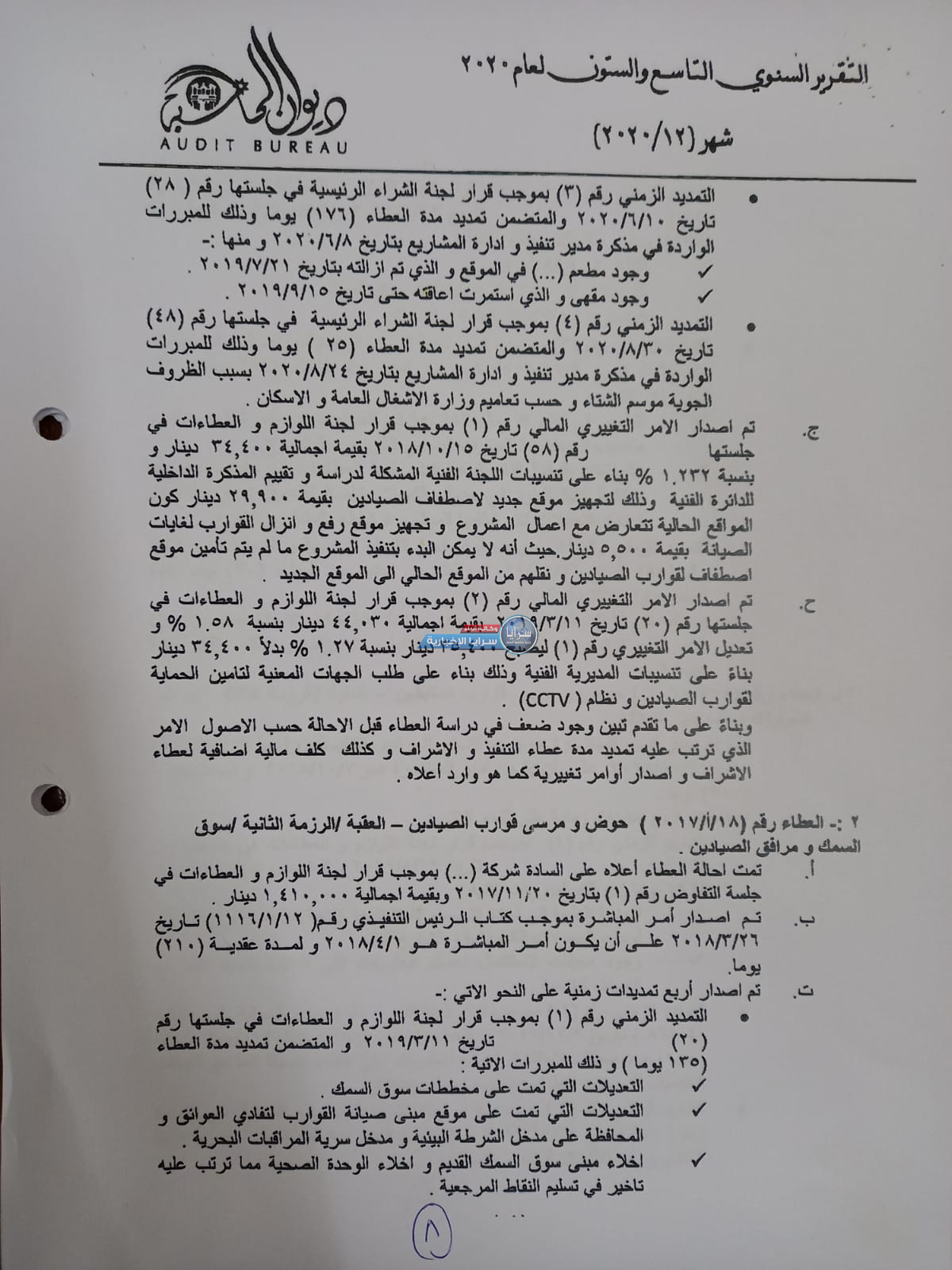 وختم التقرير أن العطاء 15/أ/2018 خدمات الإدارة الإنشائية على حوض ومرسى القوارب ، للرزم الأولى والرابعة وتصميم وتنفيذ أعادة تأهيل الشارع البحري الرزمة الخامسة والمحال بكلفة 244.900 دينار ، بمدة عقدية 365 يوما ، قبل إصدار تمديدان زمنيان ، الأول 229 يوما وبقيمة 123.900 الف دينار ، والثاني 275 يوما وبقيمة 151.349 الف دينار ، قدرت معه كلف الأوامر التغيرية 275.249 الف دينار بنسبة 112 %.