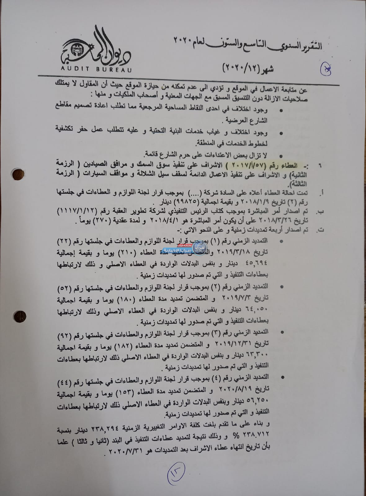 وأورد إحالة عطاء سوق السمك ومرافق الصيادين " الرزمة الثانية " ، والإشراف على تنفيذ الأعمال الدائمة لسقف سيل الشلالة ومواقف السيارات الرزمة " الثالثة " بكلفة إجمالية تقدر " 99825 " الف دينار قبل أن يتم الموافقة على أوامر تغيرية زمنية رافقت مراحل التنفيذ 238.294 الف دينار بنسبة تخطت 238% ، جراء تمديد عطاءات التنفيذ ، بالإضافة إلى اربع تمديدات زمنية قدرت 725 يوما ، في حين كانت المدة العقدية 270 يوما عند الإحالة.