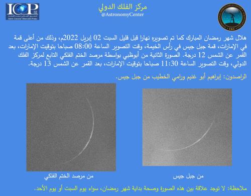 سرايا - صور مركز الفلك الدولي هلال شهر رمضان نهارا السبت 02 إبريل من أعلى قمة في الإمارات، وهي قمة جبل جيس في رأس الخيمة، الساعة 8 صباحا، بحسب تغريدة عبر حساب المركز على "تويتر".