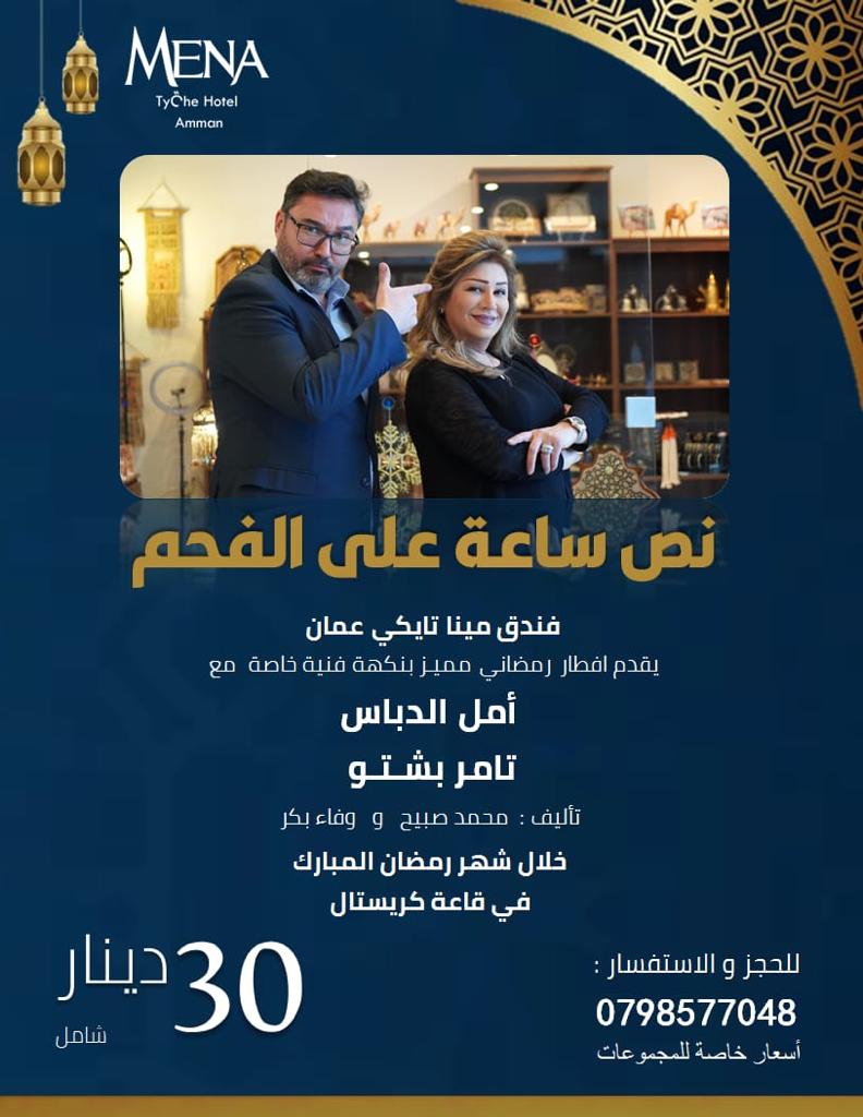 سرايا - تشارك الفنانة الاردنية أمل الدباس، في فندق مينا تايكي عمان، بمسرحية "نص ساعة على الفحم"، والتي تعرف في قاعات كريستال.حيث ترسم الفنانة أمل الدباس الابتسامة على الحاضرين وتجعل للافطار نكهة فنية فكاهية خاصة.