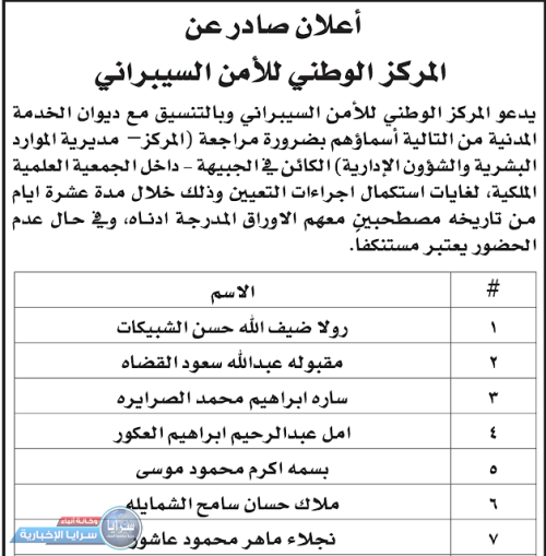 سرايا - دعا ديوان الخدمة المدنية بالتعاون مع مختلف الوزارات والمؤسسات الحكومية، التالية اسماؤهم لاجراء المقابلات الشخصية وعقد الامتحان التنافسي لغايات التعيين.