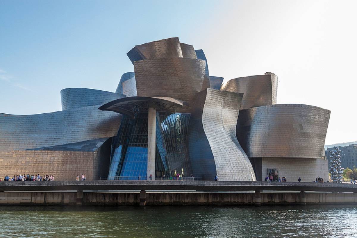 صممه فرانك جيري، متحف غوغنهايم في بلباو، إسبانيا هو متحف فني حديث مذهل مغطى بالتيتانيوم وربما أكثر المباني شهرة في التسعينيات. المنحنيات الرشيقة الحسية، التي تذكر بالسفن التي كانت موجودة في كل مكان على طول أرصفة بلباو، مغطاة بمربعات من التيتانيوم، تتلألأ في ضوء الشمس. يضم المتحف معروضات دائمة وزائرة لأعمال فنانين إسبان وعالميين.
