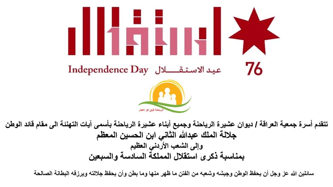 عشيرة الرياحنة تهنئ الوطن وقائد الوطن بمناسبة ذكرى الاستقلال