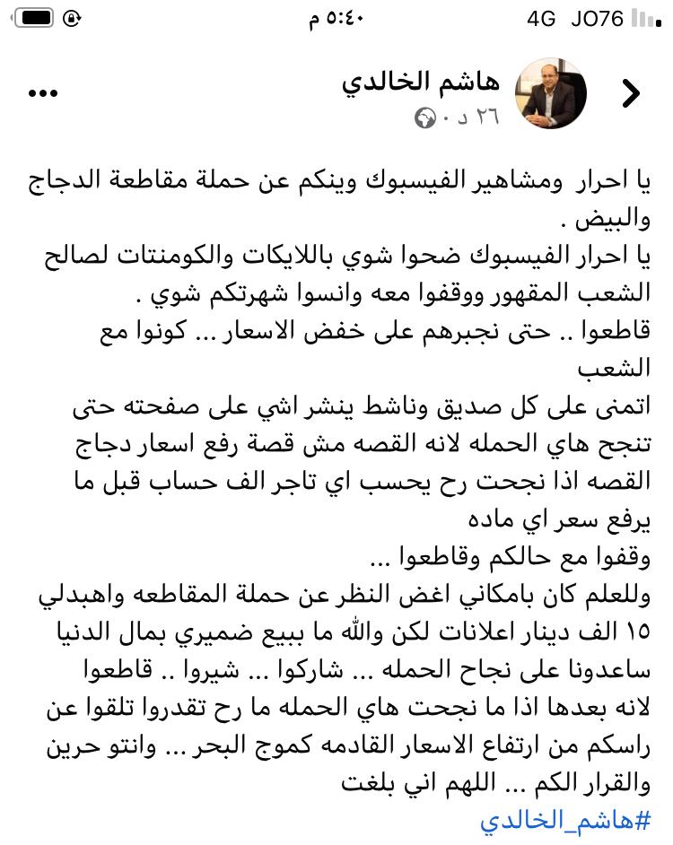 وجاءت هذه المقاطعة بعد ارتفاع سعر الدواجن في الأردن لأسعار جنونية، أثارت غضب المواطنين، ليطلق العديد من النشطاء حملة شعبية على المرابين، رافعين شعارا فكاهيا "خليها تبيض عندكو"، حيث استجاب المواطنون لهذه الحملة، وتوقفوا عن شراء الدجاج والبيض حتى انخافض أسعاره .