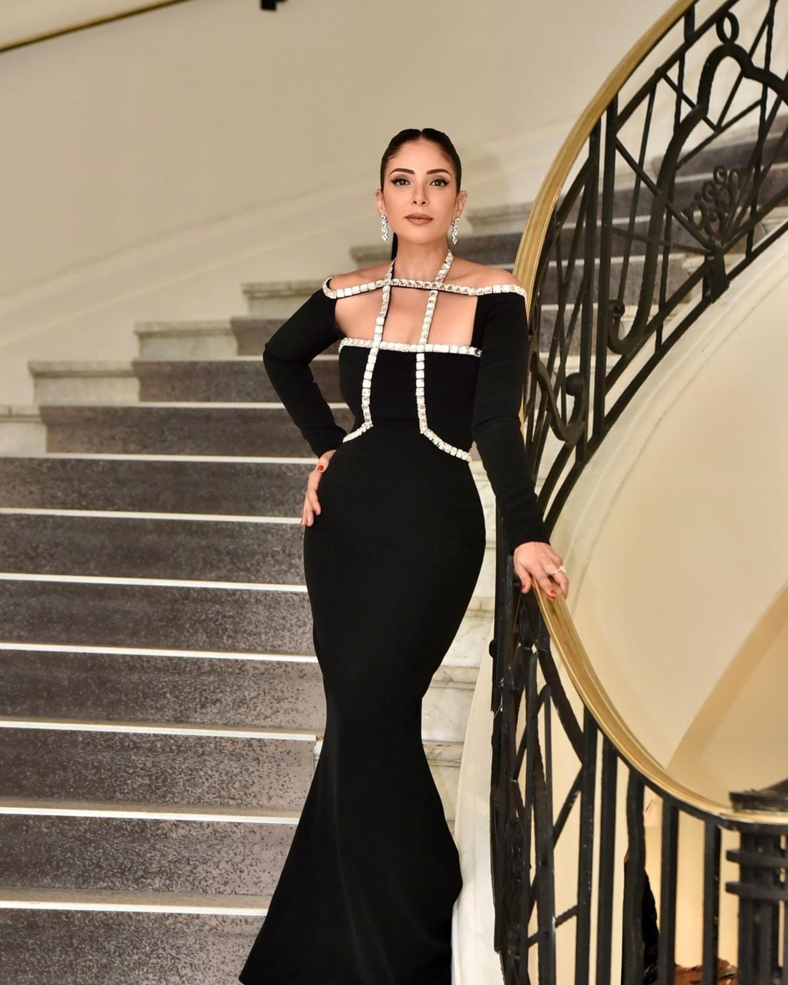 وقد إرتدت فستاناً رائعاً باللون الأسود، مرصعاً بحبات اللولو، من تصميم المصمم اللبناني جورج حبيقة.