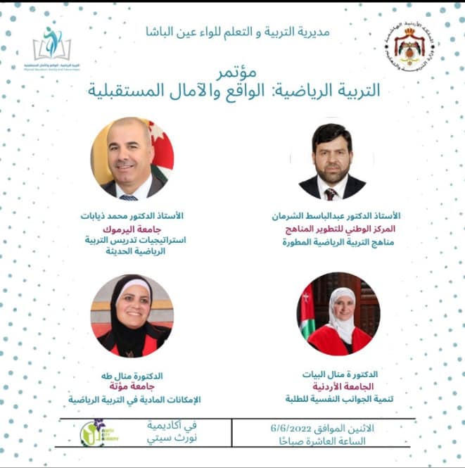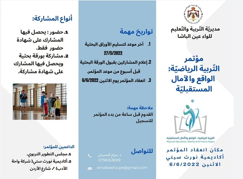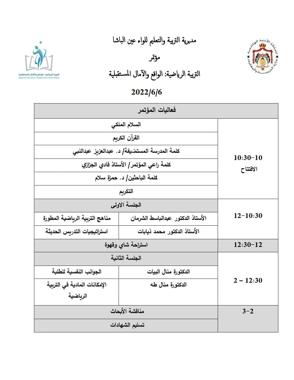 بتوجيهات من عطوفة مدير التربية والتعليم للواء عين الباشا الأستاذ / فادي الجزازي، ستقيم مديرية التربية والتعليم للواء عين الباشا المؤتمر الرياضي الأول تحت عنوان: ( التربية الرياضية/ الواقع والآمال المستقبلية) والذي سينعقد يوم الإثنين الموافق ٢٠٢٢/٦/٦م في أكاديمية نورث سيتي.