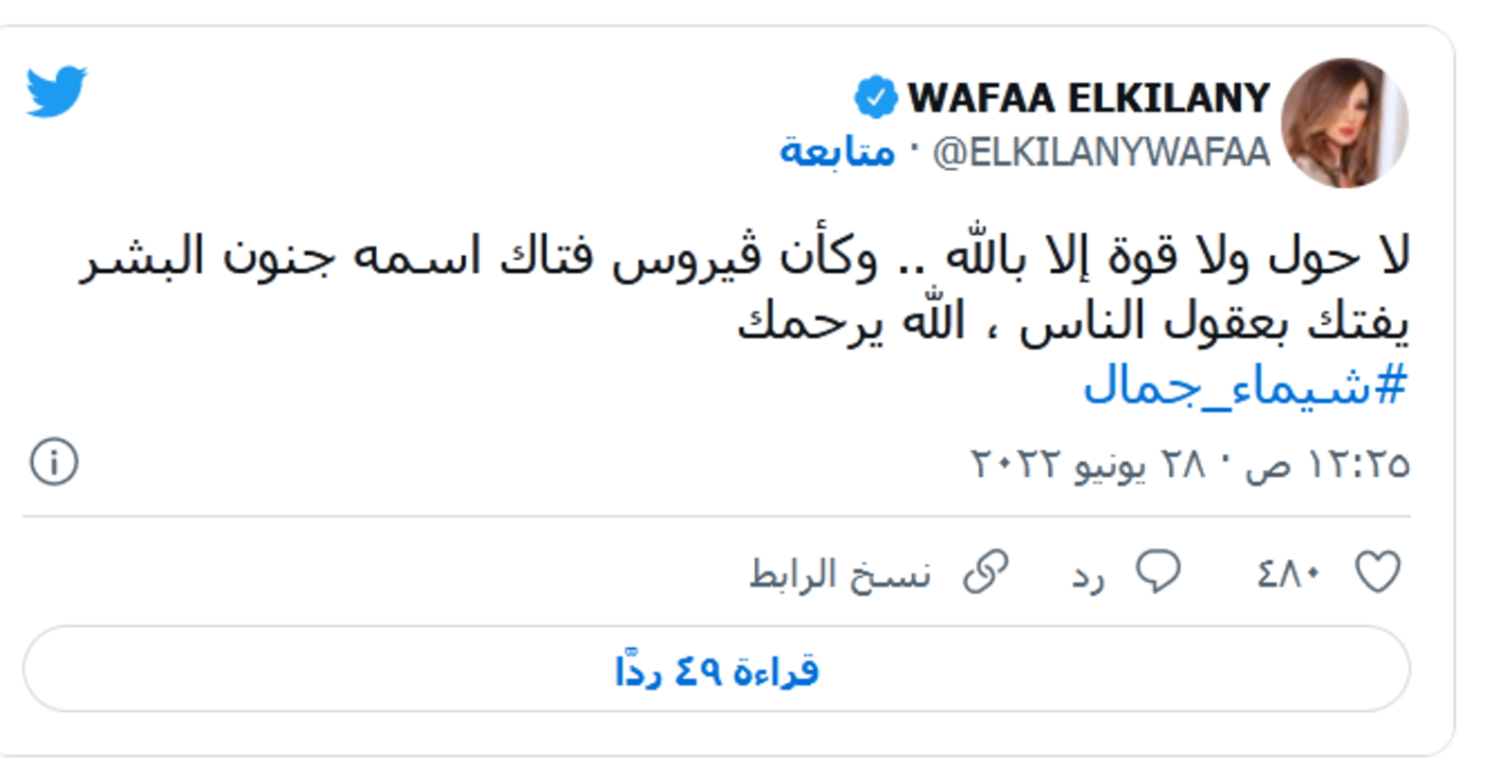 وكتبت الكيلاني في منشور عبر حسابها الرسمي بموقع التواصل الإجتماعي: "لا حول ولا قوة إلا بالله.. وكأن ڤيروس فتاك اسمه جنون البشر يفتك بعقول الناس، الله يرحمك".