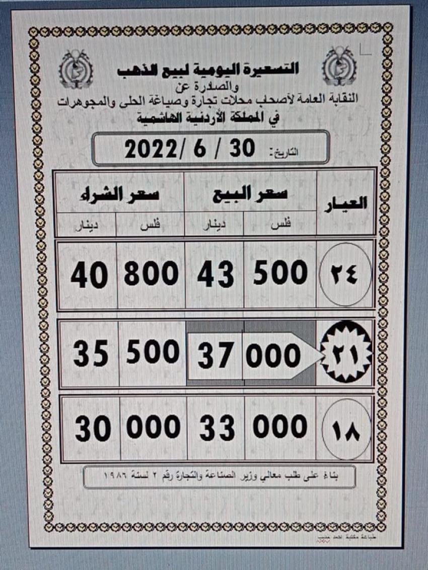 وبلغ سعر بيع غرام الذهب عيار 21 الأكثر رغبة لدى المواطنين في السوق المحلية، عند 37.00 دينارا لغايات الشراء من محلات الصاغة، مقابل 35.50 دينارا لجهة البيع.