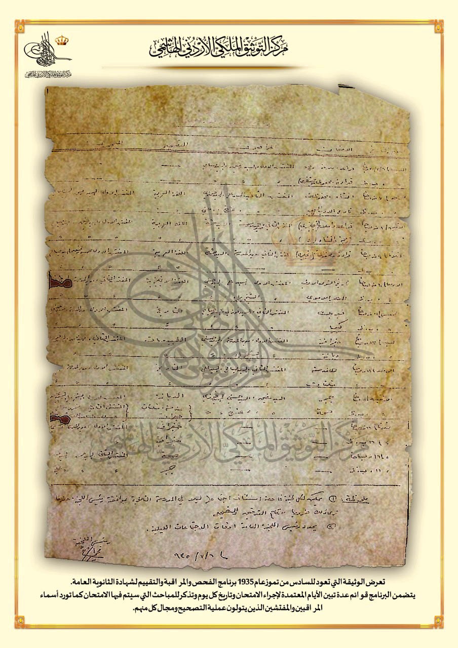 سرايا - عرض مركز التوثيق الملكي، اليوم الخميس، وثيقة بمناسبة بدء امتحانات شهادة الثانوية العامة، تعود للعام الدراسي 1934/1935، وتتضمن برنامج الفحص والمراقبة والتقييم.