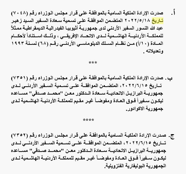 سرايا - صدرت الإرادة الملكية السامية، بتسمية عدد من السفراء الأردنيين في الخارج.وتالياً الأسماء: