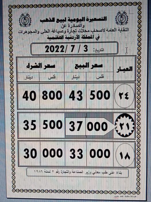 بلغ سعر بيع غرام الذهب عيار 21 الأكثر رغبة من الأردنيين بالسوق المحلية عند 37,00 دينارا لغايات شراء المواطنين من محلات الصاغة.