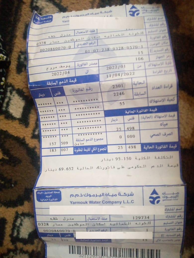 وتابع رب الأسرة أنه لا يتوفر "مروحة" بالمنزل قائلاً "لا امتلك ثمن مروحة لأقي أبنائي حر الصيف " إضافة الى عدم توفر اي مادة غذائية، وتراكمت فواتير المياه على المنزل بشكل متكرر ولا يوجد قدرة على سدادها.