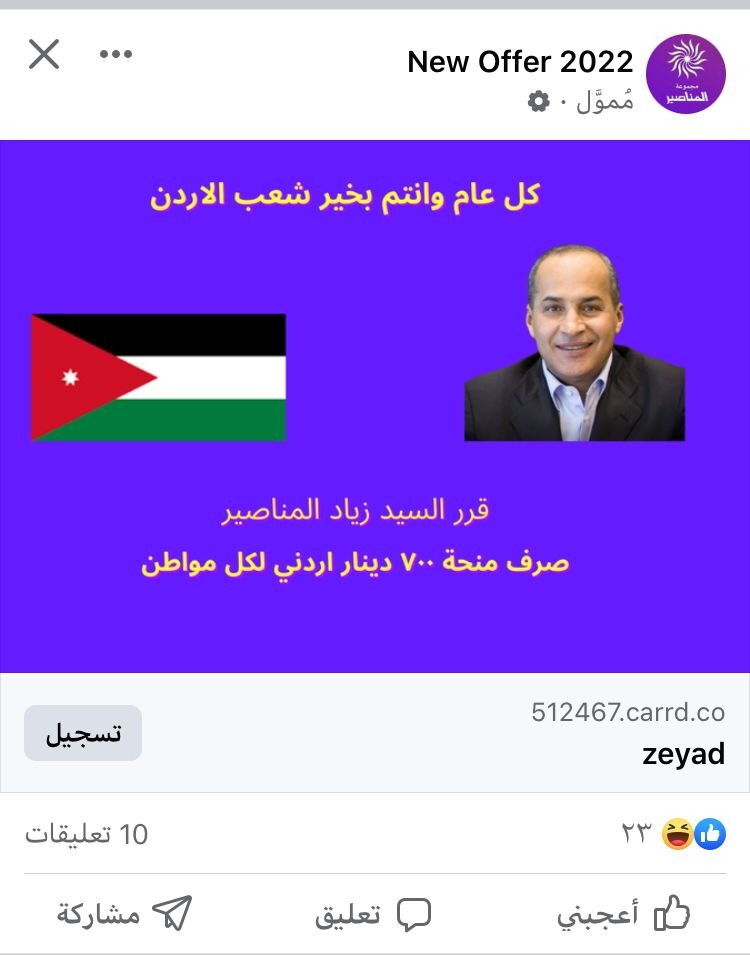 سرايا - خاص - قال مصدر في مجموعة المناصير لسرايا، اليوم الأحد، إن احدى الصفحات الوهمية على منصة التواصل الإجتماعي "فيسبوك" قامت بنشر معلومات كاذبة تفيد باصدار المهندس زياد المناصير رئيس هيئة المديرين - مجموعة المناصير - يقضي بصرف مبلغ 700 دينار أردني لكل مواطن.