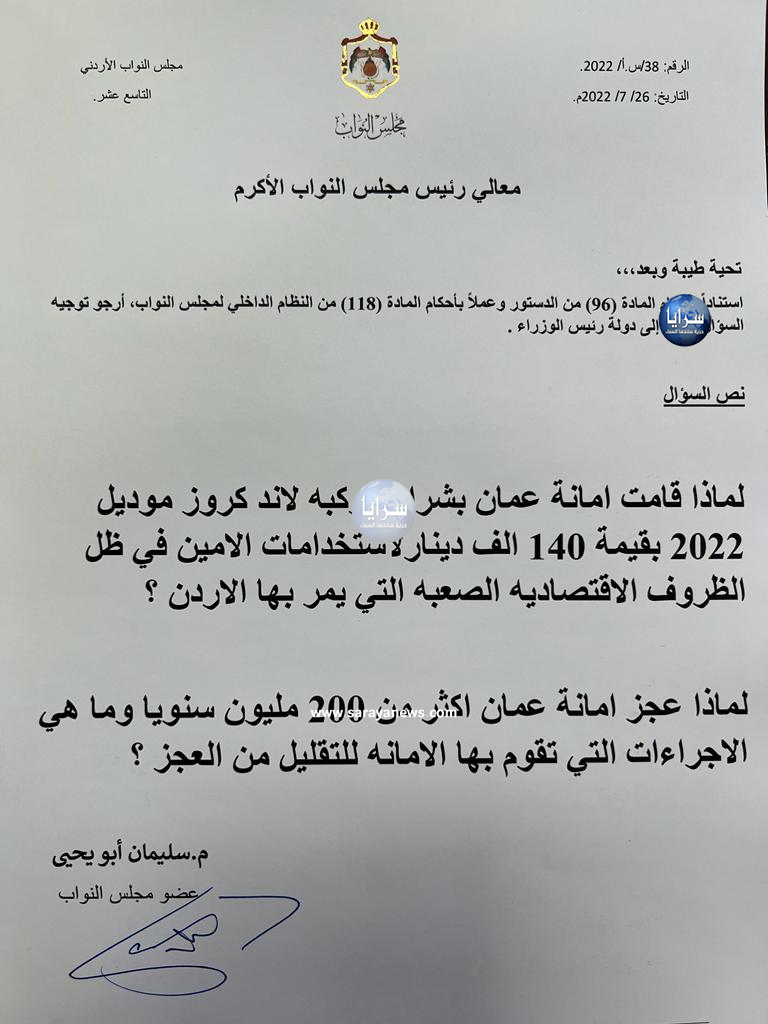 سرايا - وجه النائب سليمان ابو يحيى اليوم الثلاثاء، سؤالاً لرئيس الوزراء بشر الخصاونة، حول شراء مركبة "لاند كروز" موديل 2022 بقيمة 140 ألف دينار لأمين عمان، في ظل الظروف الاقتصادية الصعبة.
