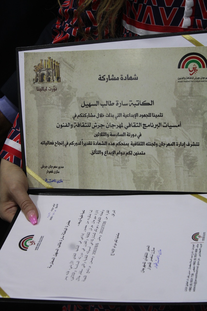 و شكرت الكاتبة سارة السهيل وزارة الثقافة الاردنية متمثلة بوزيرة الثقافة معالي هيفاء النجار و رئيس مهرجان جرش عطوفة مازن قعوار و الاديب نضال العياصرة و خصت بالشكر رئيس اتحاد الكتاب الاردنيين عطوفة عليان العدوان لمبادراته الواضحة لخدمة الاتحاد و الكتاب الاردنيين
