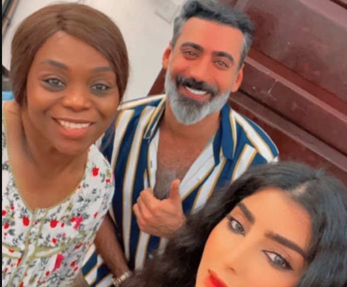 ونشرت بثينة صورةً في "ستوري إنستجرام"، ظهرت فيها بـ "لوكيشن العمل" مع الفنان محمد العلوي، والفنانة فتات سلطان.