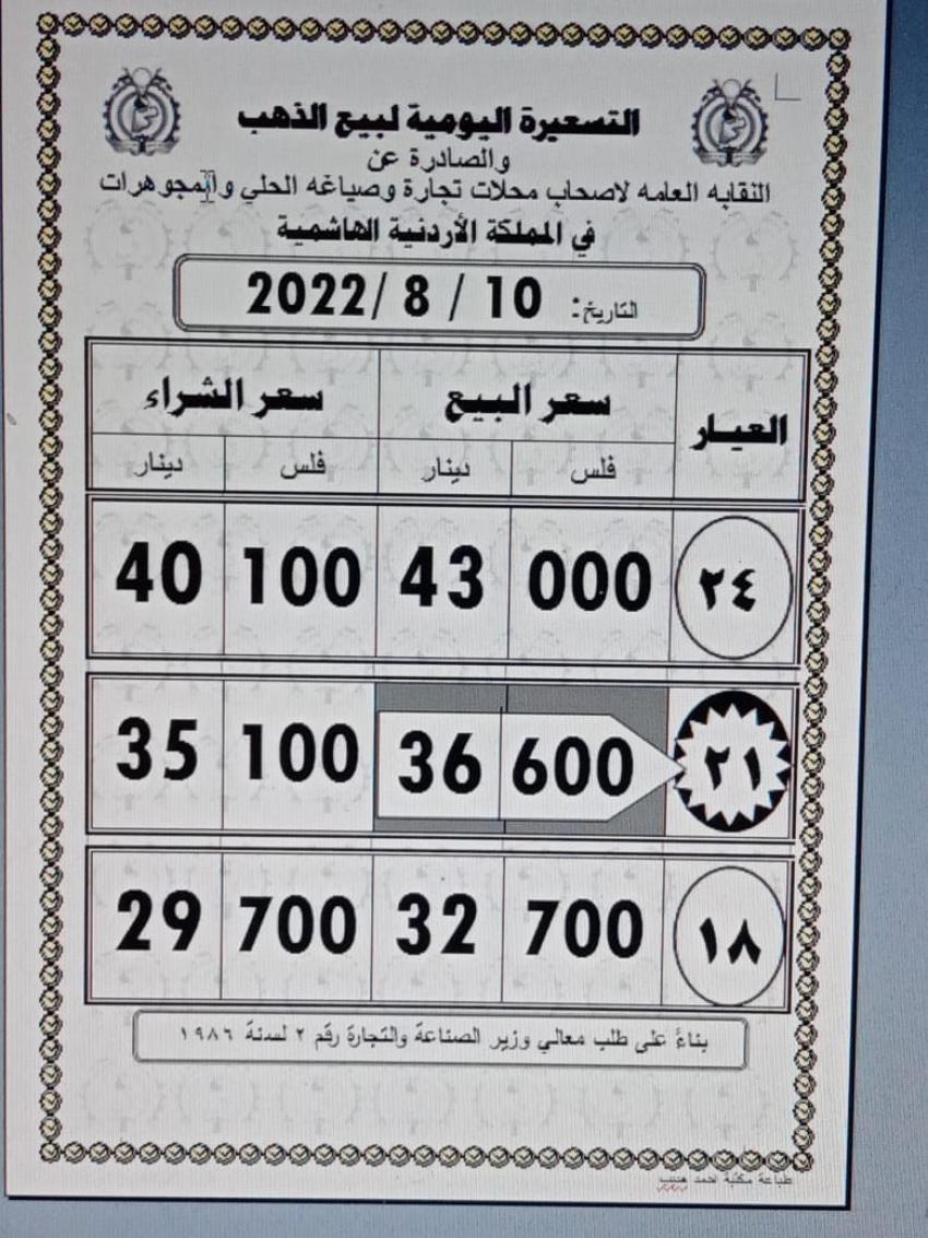 وكما بلغ سعر بيع الغرام من الذهب عياري 24 و18 لغايات الشراء من محلات الصاغة عند 43.0 و 32.70 دينارا على التوالي.