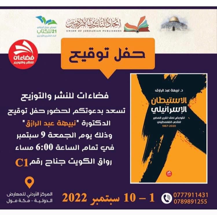 سرايا - وقع يوم أمس الجمعة كتاب "الاستيطان الاسرائيلي .. تقويض لحق تقرير المصير للشعب الفلسطيني" للدكتورة نبيهة عبد الرزاق، بالتعاون مع اتحاد الناشرين الأردنيين وفضاءات للنشر والتوزيع.