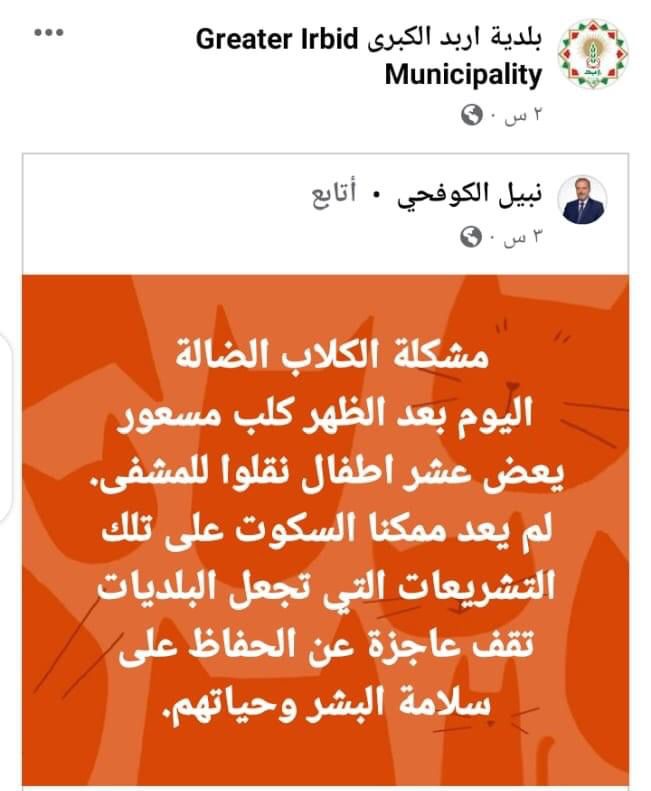 سرايا - عقر كلب مسعور 10 أطفال في اربد، وفق رئيس بلدية اربد الكبرى نبيل الكوفحي