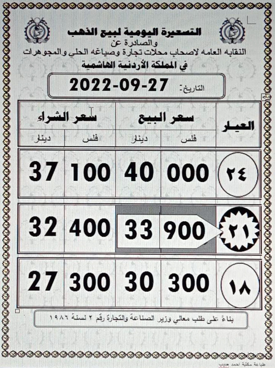 في المقابل بلغ سعر الذهب عياري (24) و (18) 40.00 دينارا و 30.30 دينار على التوالي لجهة شراء المواطنين من التجار.