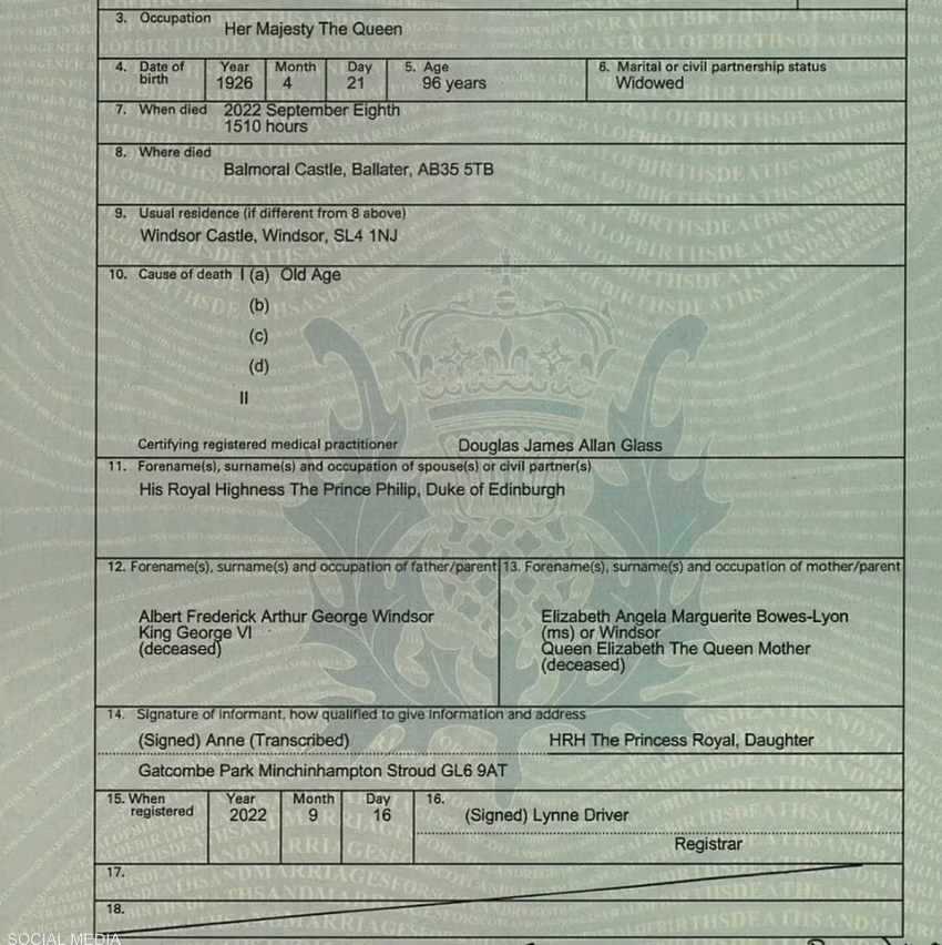 وبعد مرور 10 أيام على جنازتها الرسمية، نشر الموقع الرسمي لـ"المحفوظات الوطنية في اسكتلندا"، اليوم، شهادة وفاة الملكة إليزابيث.