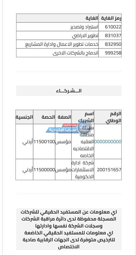 مبينا انه في اعقاب تكليفه رئيسا تنفيذيا لشركة تطوير العقبة ، كلف محامي الشركة العمل على إسقاط صفته التجارية في الشركة ، تحسبا لتضارب العمل ، رغم الإبقاء عليه بصفة الشريك بحسب سجلات مراقبة الشركات.