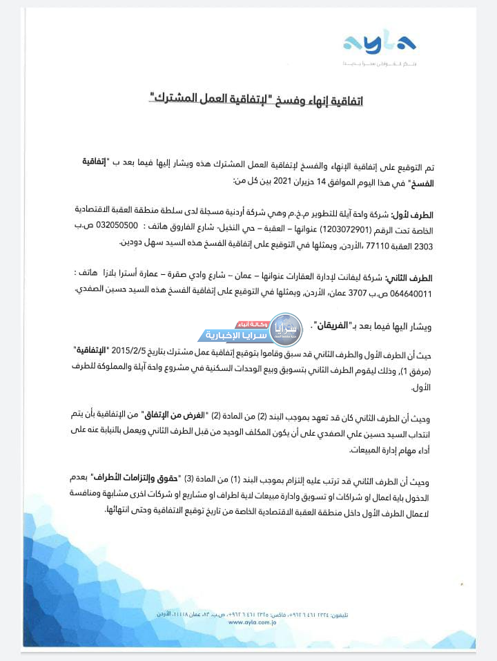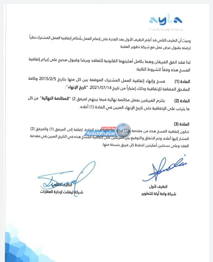 ولفت البيان إلغاء الاتفاقية المبرمة مع مشروع واحة آيلة ، وإيقاف كافة التعاقدات والمعاملات التجارية في العقبة.