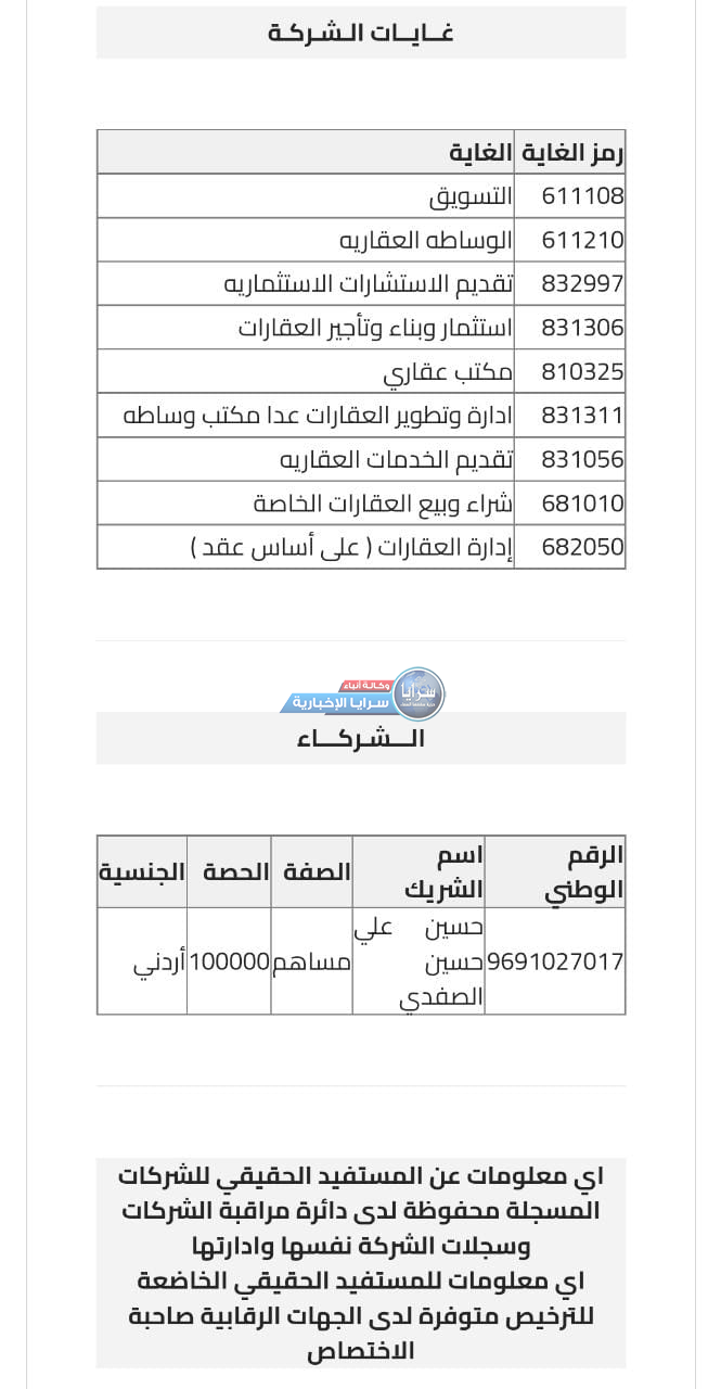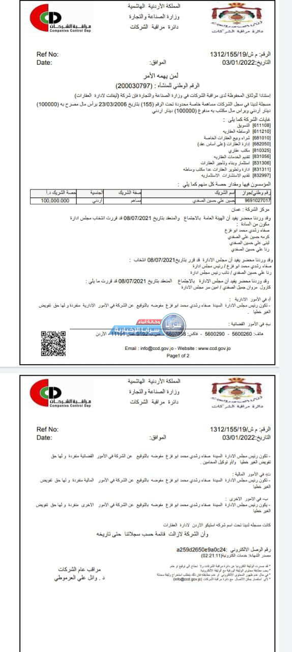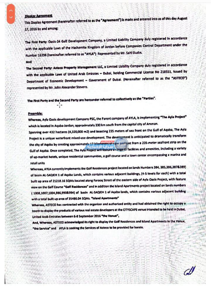 ولفت الصفدي في اتصال هاتفي لـ " سرايا " إلى أن الشركة قائمة منذ سنوات ، وقبل توليه مهام رئاسة شركة تطوير العقبة الذراع المطور الاستثماري في المنطقة الخاصة ، سبق أيضا استحواذها على اتفاقيات تسويق وبيع عقارات في مشاريع العقبة ، قبل فسخ الاتفاقية قبل تكليفه رئيسا تنفيذيا لشركة تطوير العقبة بثلاثة أيام ، ووقف كافة أنشطتها في العاصمة الاقتصادية العقبة.