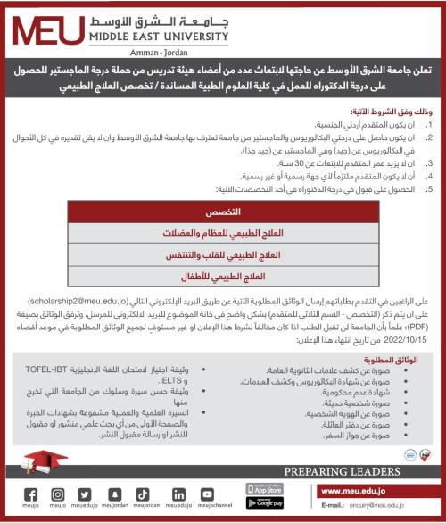 اعلنت جامعة الشرق الأوسط عن حاجتها لابتعاث اعضاء هيئة تدريس من حملة درجة الماجستير للححصول على شهادة الدكتوراه للعمل في كلية العلوم الطبية المساندة/ تخصص العلاج الطبيعي.