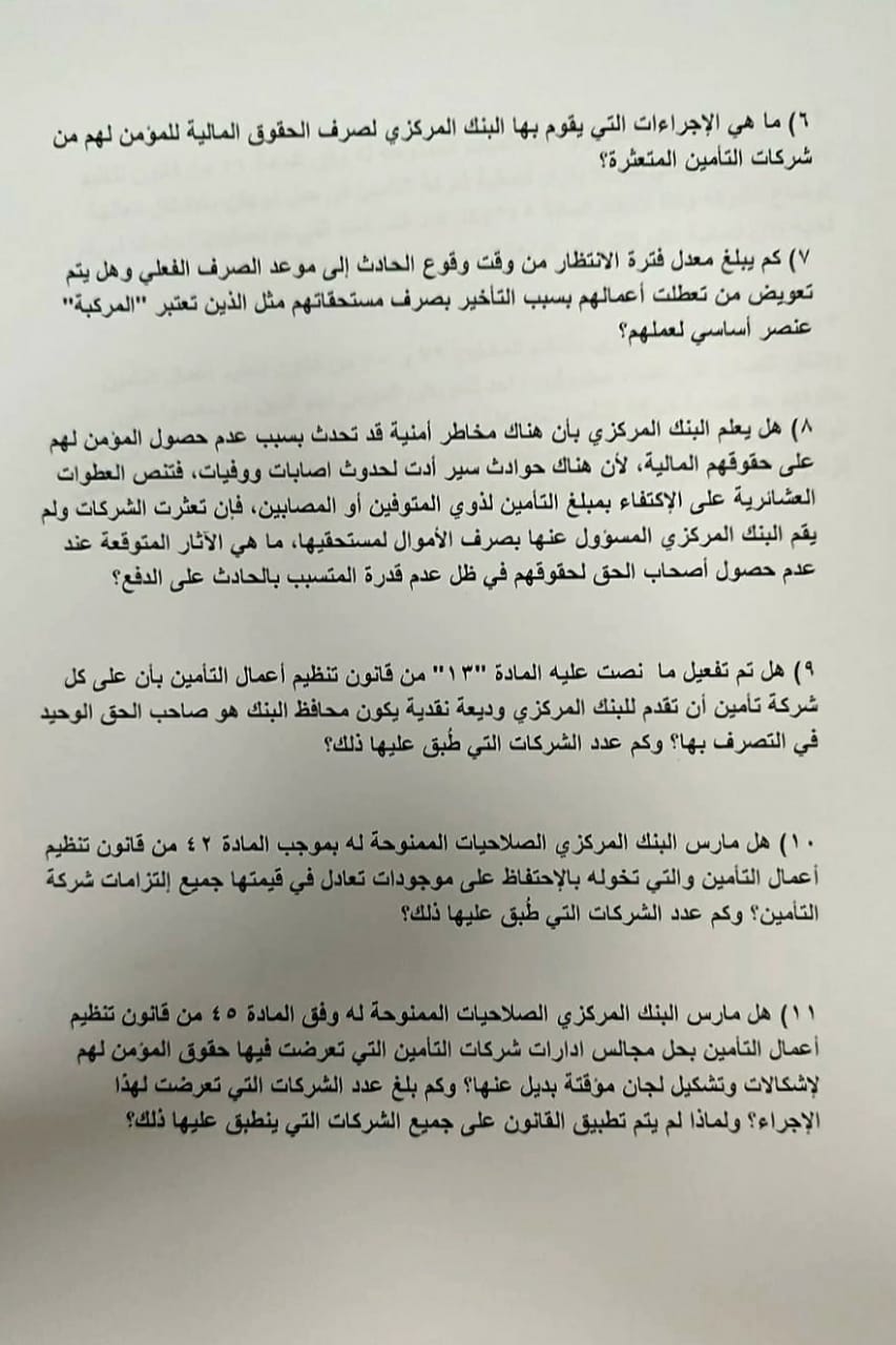 ١) كم عدد شركات التأمين المتعثرة مالياً والتي لم تعد تملك سيولة كافية لتغطية التزاماتها، وما هي الاجراءات التي اتخذها البنك المركزي لحماية حقوق المؤمن لهم؟