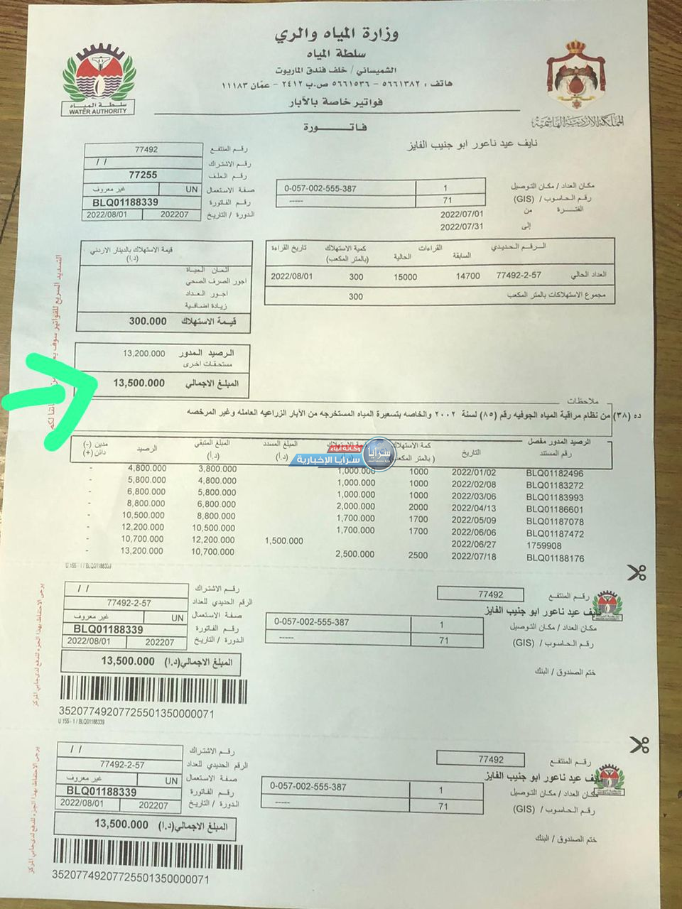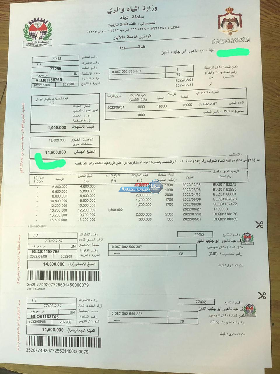 ونحن نرفق صور لفواتير المياه الصادرة عن وزارة المياه والري ليطلع الرأي العام عن الحقيقه كما هي.