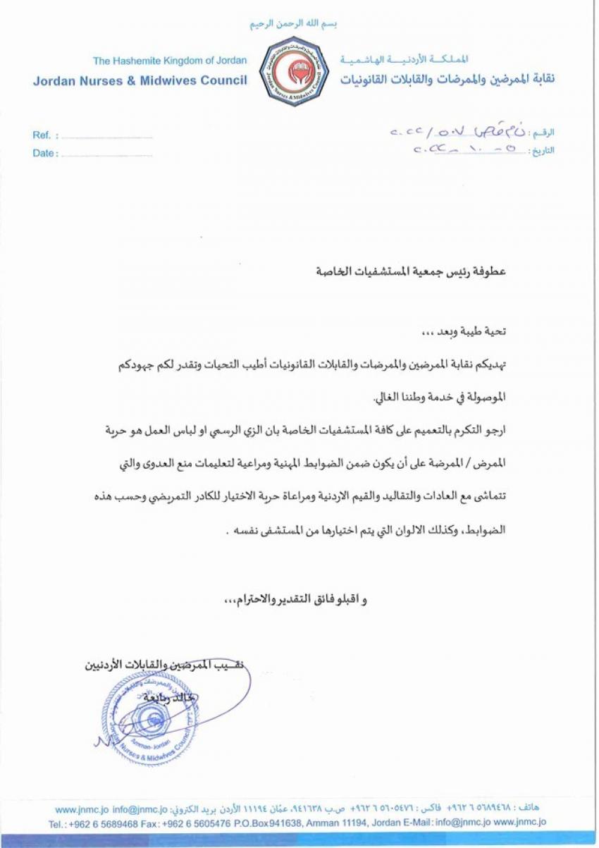 وطالبت النقابة بالتعميم على جميع المستشفيات بأن الزي الرسمي ولباس الممرض والممرضة هو حرية شخصية، شريطة أن يكون ضمن الضوابط المهنية ومراعياً تعليمات منع العدوى التي تتماشى مع العادات والتقاليد والقيم الأردنية.