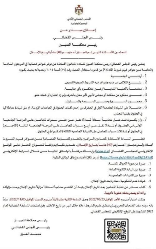 سرايا - أعلن رئيس المجلس القضائي / رئيس محكمة التمييز عن توفر شواغر قضائية في الدرجتين السادسة والخامسة للمحامين الاردنيين الأساتذة الذين لم تتجاوز أعمارهم (40) عاما ممن تتوفر فيهم شروط المادة (9) من قانون استقلال القضاء رقم (29) لسنة 2014 وتعديلاته.