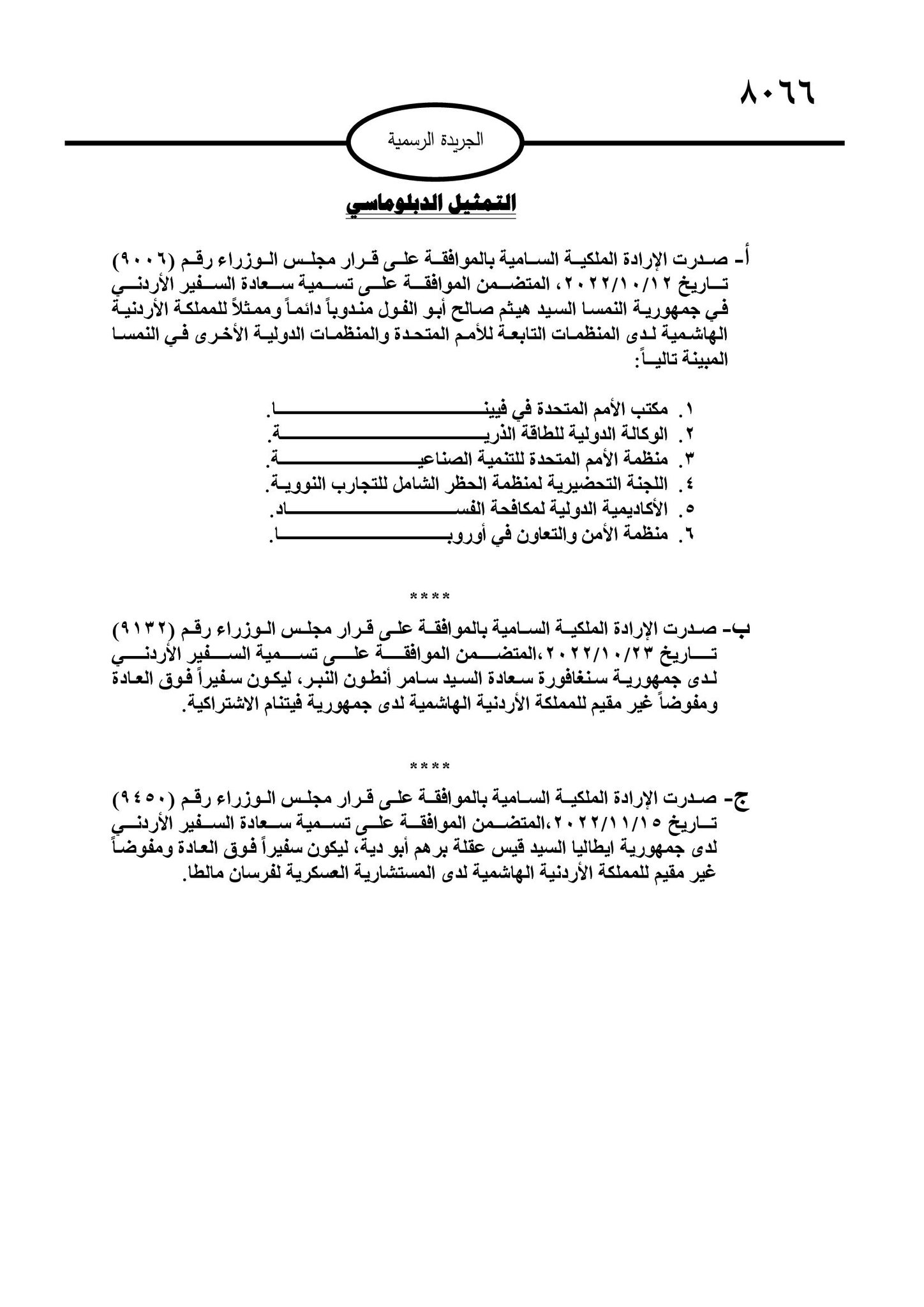 كما صدرت الإرادة الملكية السامية بالموافقة على تسمية السفير الأردني لدى جمهورية سنغافورة سامر النبر، ليكون سفيرًا فوق العادة ومفوضا غير مقيم للمملكة لدى جمهورية فيتنام.