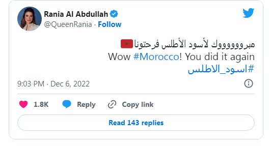 سرايا - هنأت جلالة الملكة رانيا العبدالله، أسود الأطلس بعد الانتصار المبهر على الماتادور الإسباني بركلات الترجيح، بعدما انتهت المباراة بالتعادل السلبي دون أهداف.وقالت جلالتها، في تغريدة لها عبر منصة تويتر، "مبرووووووك لأسود الأطلس فرحتونا".
