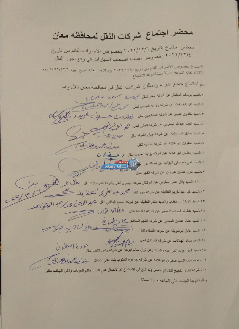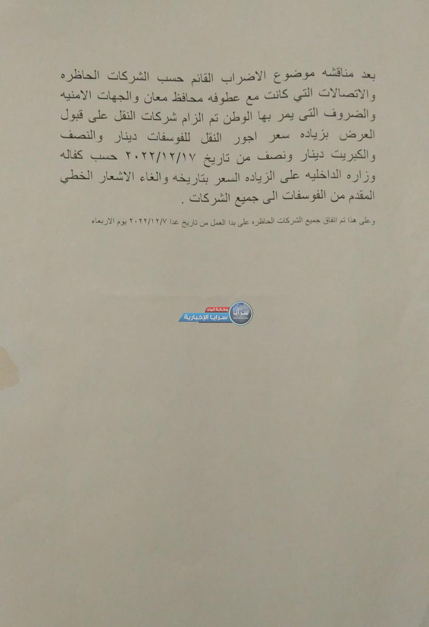 سرايا - حصلت سرايا على وثيقة اقرت بحضور محافظ معان والجهات الامنية من قبل شركات النقل العاملة في المحافظة على الغاء الاضراب واستئناف العمل كالمعتاد وقبول العرض بزيادة سعر اجور النقل للفوسفات دينار ونصف والكبريت دينار ونصف من تاريخ 17-12-2022 حسب كفالة وزارة الداخلية على الزيادة السعر بتاريخه والغاء الاشعار الخطي المقدم من الفوسفات الى جميع الشركات .