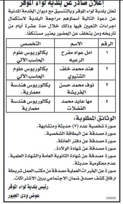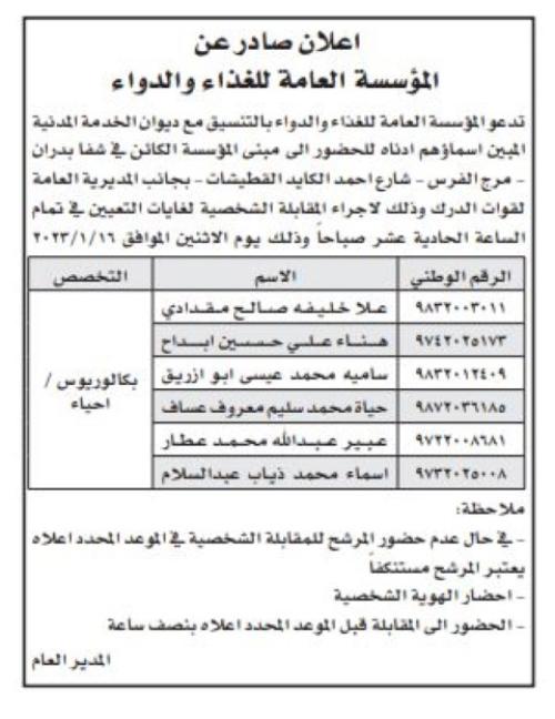 ودعت المؤسسات المدرجة أسماؤهم أدناه لاصطحاب الوثائق اللازمة للتعيين.