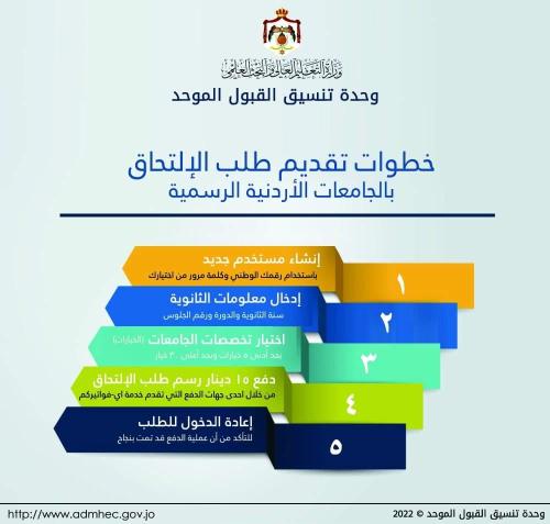 سرايا - أعلنت وزارة التعليم العالي أن تقديم طلبات القبول الموحد للالتحاق بالجامعات الأردنية الرسمية لخريجي الدورة التكميلية 2023 ينتهي عند الساعة 12 ليلاً من اليوم السبت.