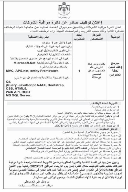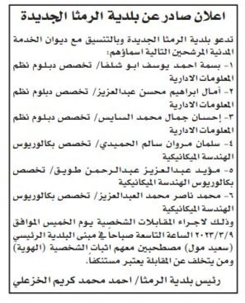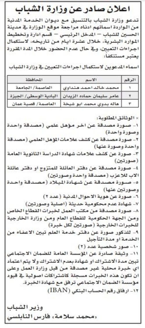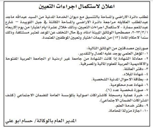 سرايا - أعلنت عدد من الوزارات والمؤسسات الحكومية اليوم الأربعاء، بالتنسيق مع ديوان الخدمة المدنية، عن حاجتها لتعبيئة وظائف شاغرة، كما دعت عدد من المرشحين لاستكمال اجراءات التعيين .
