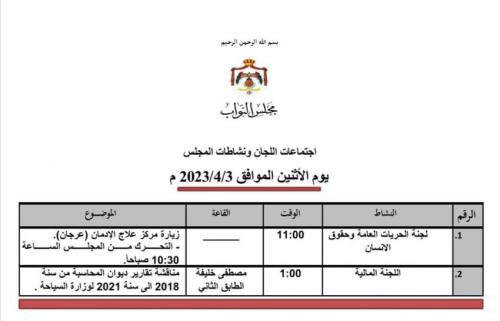 سرايا - تعقد لجان نيابية في مجلس النواب اليوم الاثنين؛ اجتماعات لمناقشة مشاريع قوانين أحيلت إليها من المجلس، وقضايا متعددة.