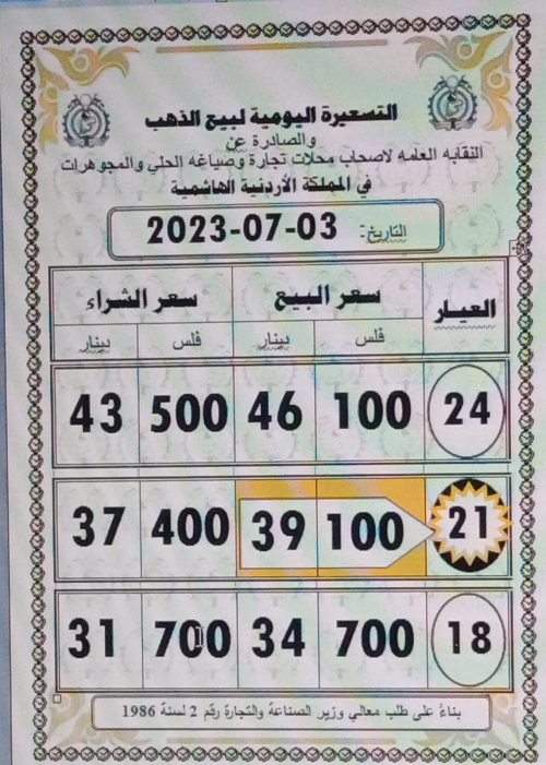 و بلغ سعر غرام الذهب من عيار 21 وهو الأكثر رغبة لدى الأردنيين 39.1 دينارا للبيع للمواطنين، و 37.4 للشراء من المواطنين.