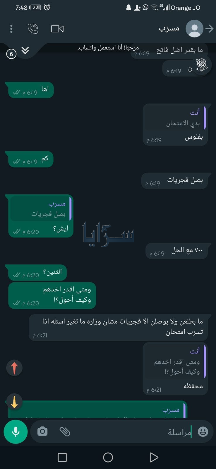 وبحسب صورة لمحادثة واتساب نشرتها قبيلات، فقد عرض احدهم على أخر ورقة امتحان الاحياء المتداولة مع حل اجابات الاسئلة مقابل 700 دينار.