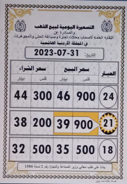 وبلغ سعر غرام الذهب عيار 21 الأكثر طلبا من قبل الأردنيين، 39.9 دينارا للبيع للمواطنين، مقابل 38.2 للشراء من المواطنين.