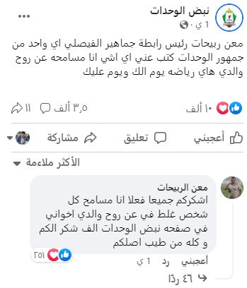 وقال ربيحات عبر صفحته على الفيسبوك:" اخواني و قرايبي اي واحد من جمهور الوحدات بحكي أو بكتب عني اي اشي انا مسامحه عن روح ابوي.. ما حدا يبعث الي اي اشي ع الخاص عن اي واحد وحداتي كاتب عني اي اشي هاي رياضه يوم الك و يوم عليك .. الفيصلي زعيم و سيد الكرة الاردنيه".