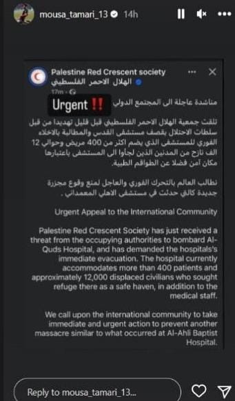 وأعاد المحترف التعمري، تدوينة التهديد الذي تلقاه جمعية الهلال الأحمر الفلسطيني من قبل جيش الاحتلال ، بقصف مشفى القدس في حي تل الهوى جنوب غرب مدينة غزة، ومطالبة جميع من فيه بالإخلاء الفوري، حيث يضم أكثر من 400 مريض وحولي 12 ألف نازح من المدنيين الذين لجأوا إليه، باعتباره مكاناً آمناً.