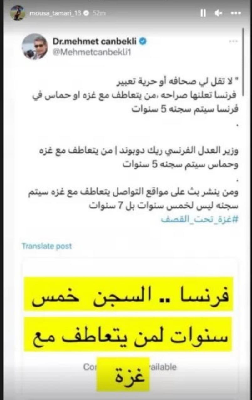 سرايا - رصد - يوسف الطورة - لا زال نجم نادي مونبليية الفرنسي لكرة القدم ، موسى التعمري ، يواصل دعمه لفلسطين، من خلال حسابه على منصة إنستغرام، على الرغم من مخاطر العقوبات المحتملة في فرنسا لمن يعبر عن تضامنه مع فلسطين ومدينة غزة.