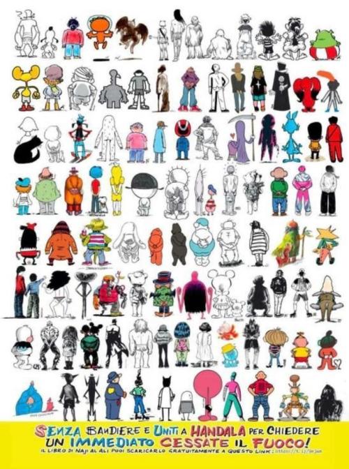 سرايا - نشرت مجلتا ارباتشي وبايينا 21، "بوستر" لـ80 شخصية كرتونية إيطالية تدير ظهرها كحنظلة ناجي العلي؛ للمطالبة بوقف فوري لإطلاق النار في غزة.