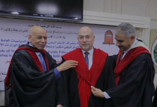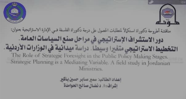 سرايا - أتم اللواء المتقاعد العين سمير بينو، مناقشة أطروحة الدكتوراه استكمالاً لمتطلبات الحصول على درجة دكتوراة الفلسفة في الإدارة الاستراتيجية بعنوان (دور الاستشراف الاستراتيجي في مراحل صنع السياسات العامة، التخطيط الاستراتيجي متغيراً وسيطاً دراسة ميدانية في الوزارات الأردنية).