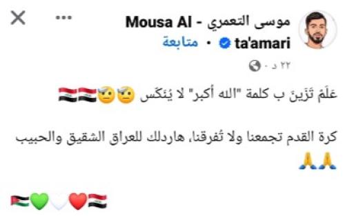 وكتب التعمري : "علم تزين بكلمة (الله أكبر) لا ينكس ،، كرة القدم تجمعنا ولا تفرقنا ، هاردلك للعراق الشقيق والحبيب" .